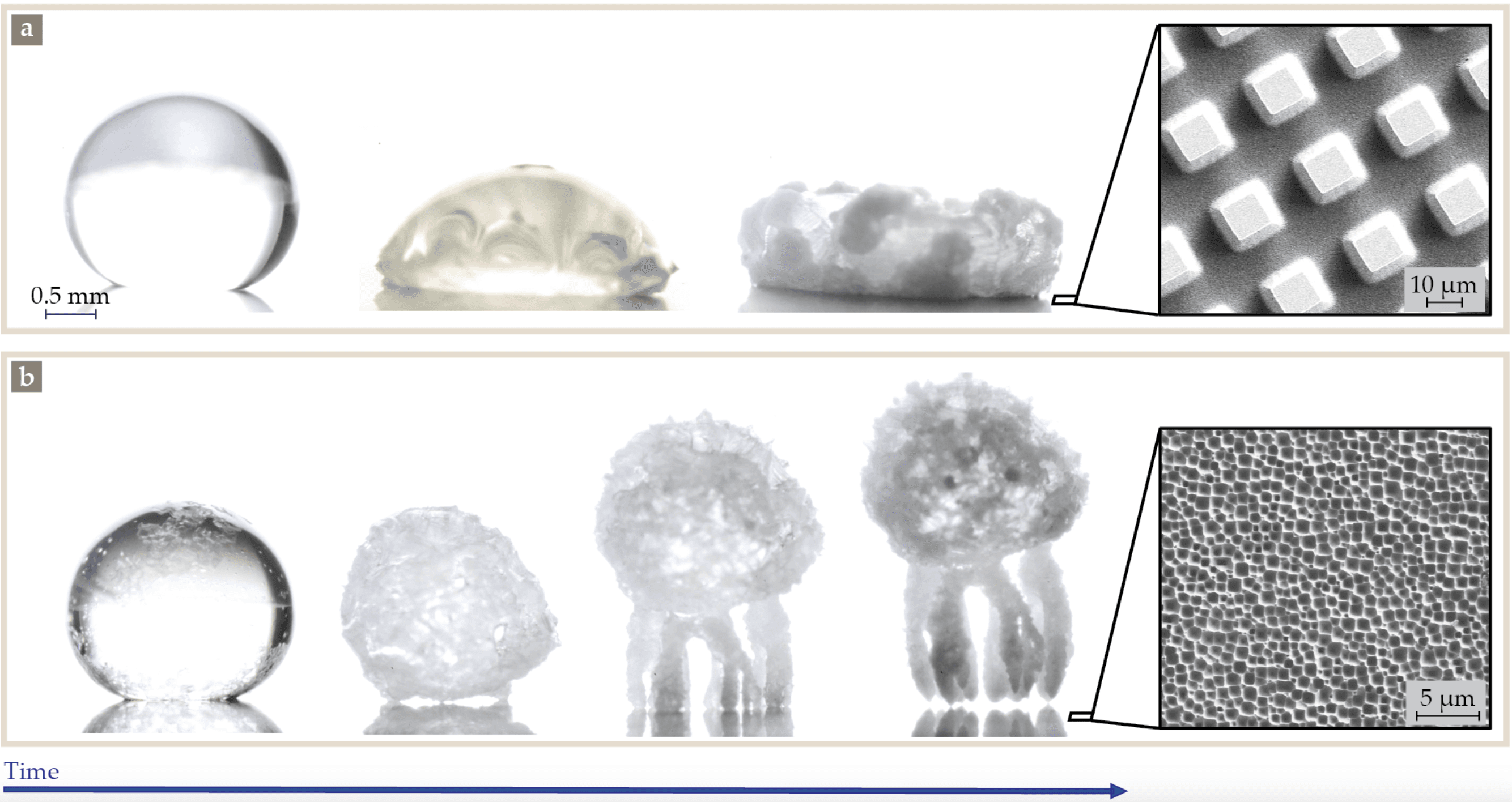 Varanasi grubu bu tür arayüz kaplamalarını araştırırken alışılmadık bir davranış fark etti: pullar malzemeden uzağa düşüyordu. Beklendiği gibi buharlaşan damlalardan kristaller oluştu, ancak malzeme 50 °C’nin üzerine ısıtıldığında kristaller kaplamadan kendiliğinden fırladı. Uzun, ince yapılar büyüdü ve tuz kristali yapısını yukarı, yüzeyden uzağa itti. Denizanasına ve diğer canlılara olan benzerlikleri, ürkütücü, gerçekçi büyümelerine ek olarak, yapıları “kristal yaratıklar” olarak adlandırmamıza neden oldu.